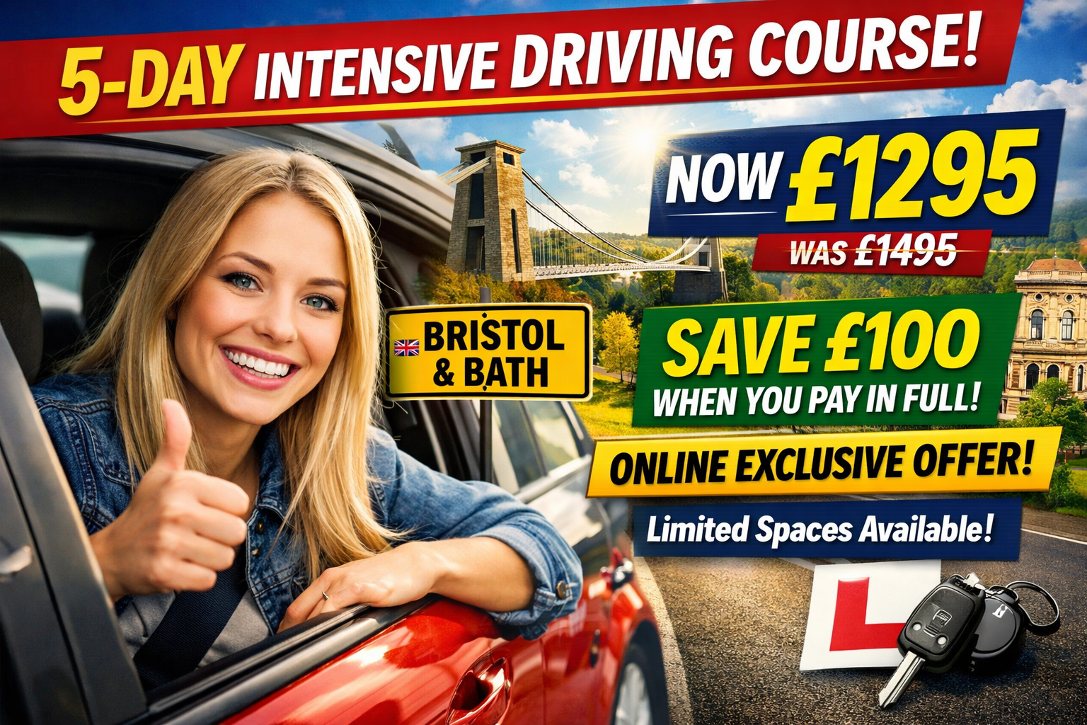 Delivered by a local Bristol & Bath-based driving school, this course helps you build confidence, improve driving standards, and prepare properly for your practical driving test β without months of weekly lessons.